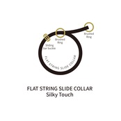 糸に独特の前処理をすることによりシルキーな綾目織に仕上げ手触りと質感。ナイロン中空糸を採用し、丈夫さと軽さを両立しました。丸ロープに比べて当たり面積が広いため優しくなり、レザーに比べて伸縮性がないので指示が伝わりやすいです。フラットストリング・スライドカラーは躾トレーニング用のチョークカラーとは違い、ストッパーが付いているので必要以上に締まることはありません。テンションが掛かっていない時は最も犬にとって優しい道具となります。