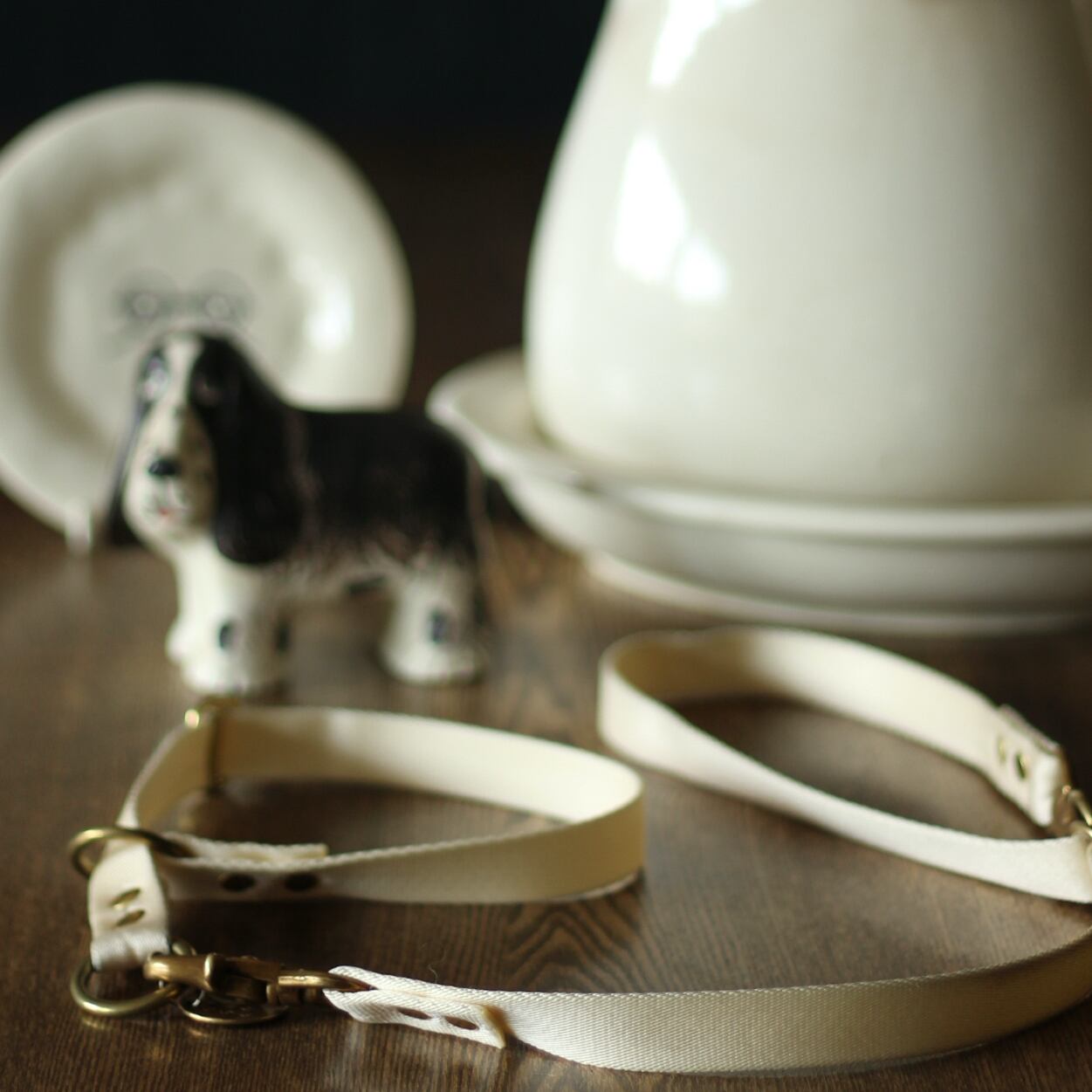 糸に独特の前処理をすることによりシルキーな綾目織に仕上げ手触りと質感。ナイロン中空糸を採用し、丈夫さと軽さを両立しました。丸ロープに比べて当たり面積が広いため優しくなり、レザーに比べて伸縮性がないので指示が伝わりやすいです。フラットストリング・スライドカラーは躾トレーニング用のチョークカラーとは違い、ストッパーが付いているので必要以上に締まることはありません。テンションが掛かっていない時は最も犬にとって優しい道具となります。